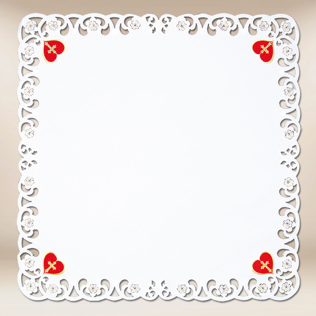Elegancka serwetka haftowana “Serce Jezusa” 95×95 wykonana z trwałego, plamoodpornego poliestru wyróżnia się subtelnymi wycięciami i czterema czerwonymi aplikacjami z symbolem krzyża.