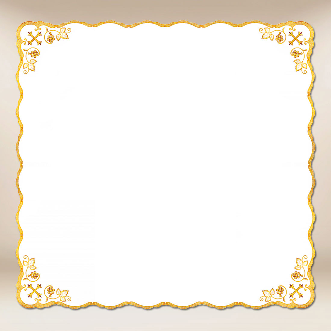 Precyzyjnie wykonany haft w odcieniach złota symbolizuje majestat, światło i chwałę, jednocześnie wprowadzając do wnętrza świątyni subtelny akcent elegancji. Złoty wzór pięknie odbija światło świec, tworząc wrażenie ciepła i harmonii. Dzięki uniwersalnemu rozmiarowi 110cm × 110cm serweta doskonale sprawdzi się zarówno jako nakrycie ołtarza bocznego, jak i element dekoracyjny stołu w zakrystii lub kaplicy.