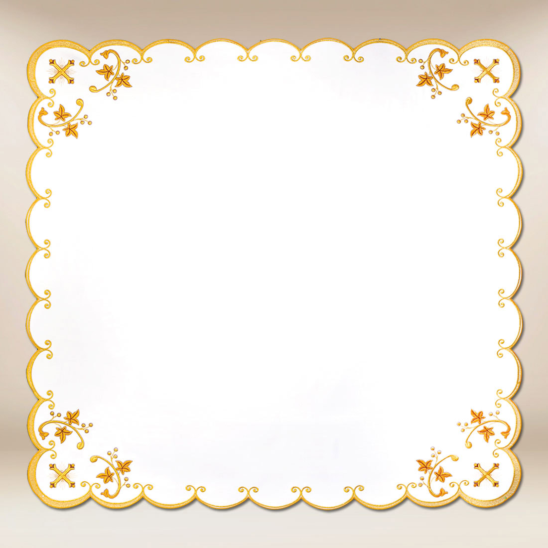 Serwetka haftowana” Złota Seria Kielich ” o wymiarach 95cm× 95cm z motywem kielicha to elegancki element wystroju ołtarza, który łączy subtelność, symbolikę i duchowe piękno liturgii. Wykonana z wysokiej jakości białej tkaniny poliestrowej, zachowuje doskonały wygląd i formę nawet po wielu praniach. Delikatny złoty haft, zdobiący krawędzie oraz centralny motyw kielicha eucharystycznego, nadaje serwetce wyjątkowy charakter, podkreślając sakralny wymiar liturgii i obecność Chrystusa w Najświętszym Sakramencie.