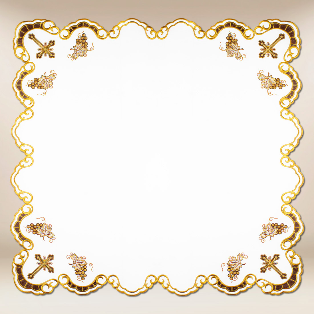 To doskonałe połączenie symboliki, trwałości i estetyki – produkt nie tylko dekoruje, ale i przypomina o głębokim znaczeniu sakramentu. Serwetka z krzyżykiem w złoto-brązowym haftem to niezbędny element wyposażenia każdej parafii, która pragnie dbać o piękną i godną oprawę liturgiczną.
