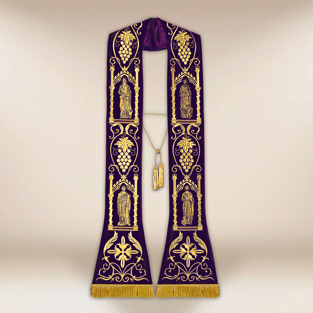 Stuła posiada rozmiar uniwersalny i doskonale układa się podczas celebracji dzięki naturalnej miękkości pluszu. To idealny wybór na uroczyste Msze święte, procesje oraz święta patronalne związane z Ewangelią.