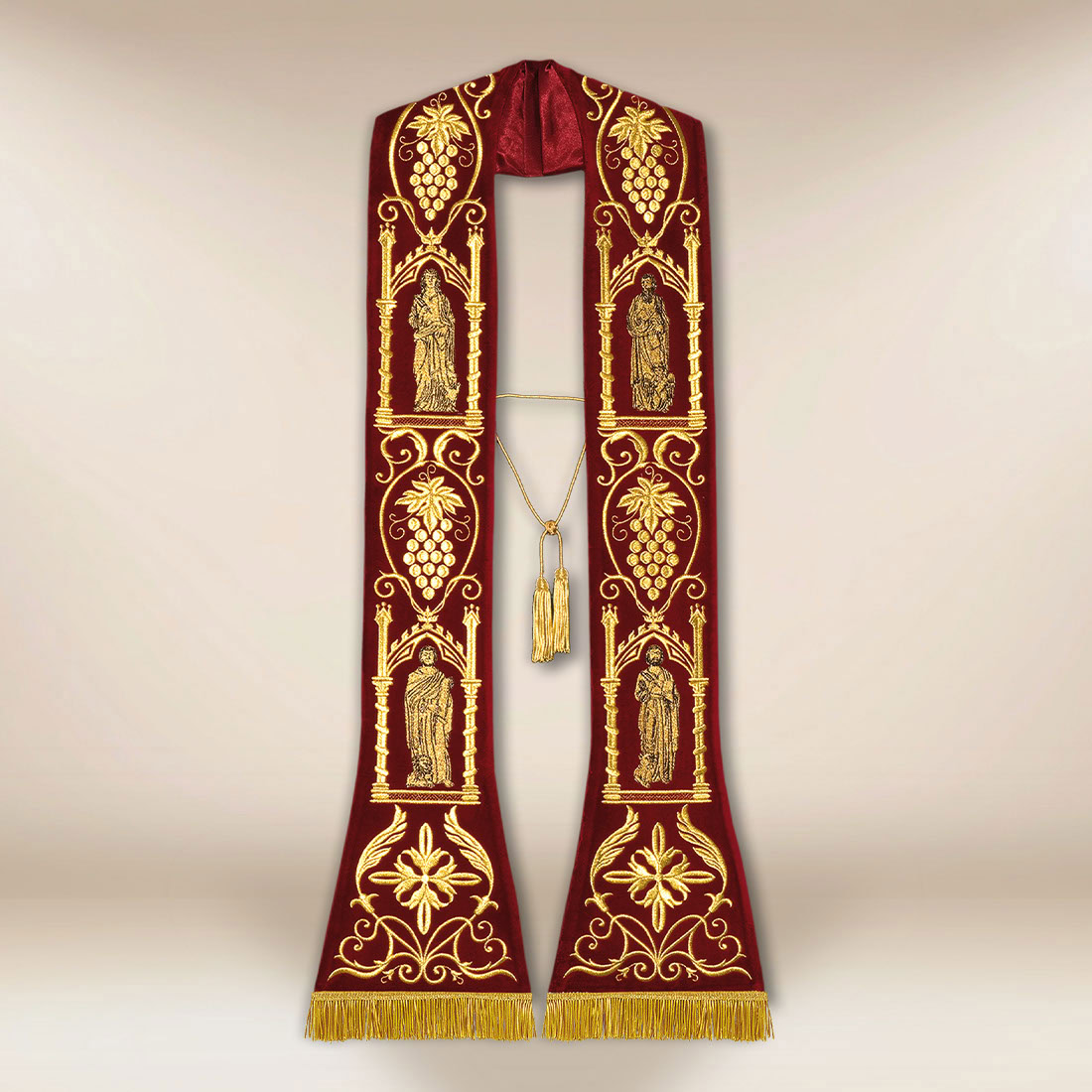 Stuła została wykończona metalizowanym cingulum oraz wysokiej jakości frędzlą włoską, nadając jej reprezentacyjny wygląd i trwałość. Dzięki naturalnej miękkości pluszu szata układa się harmonijnie i komfortowo podczas każdej liturgii.