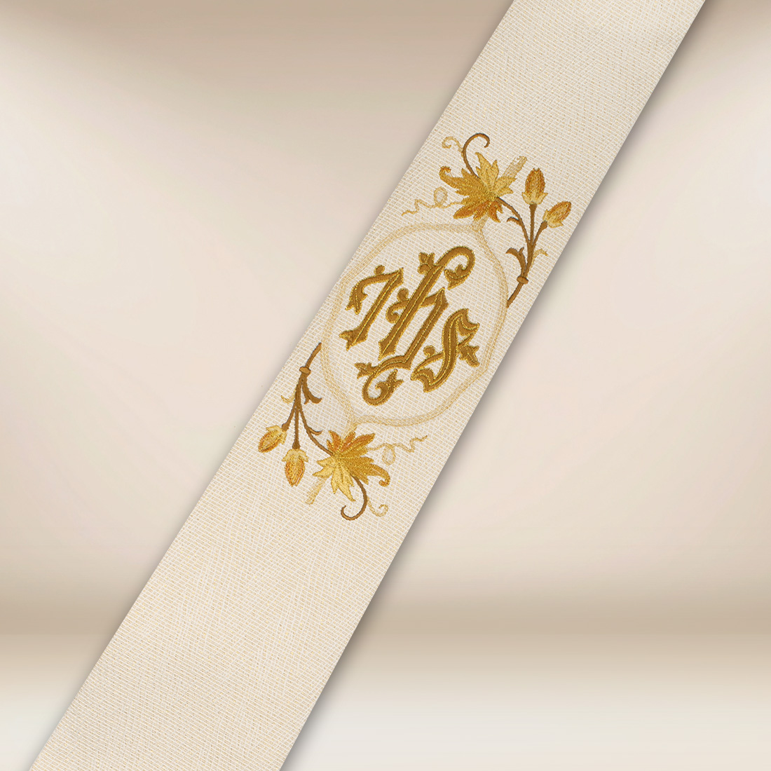Prezentowana stuła została wykonana w eleganckim kolorze ecru, który symbolizuje czystość, światło i duchową radość. Barwa ta doskonale wpisuje się w uroczyste okresy roku liturgicznego, takie jak święta, ważne jubileusze czy sakramenty. Centralnym elementem dekoracyjnym jest haftowany symbol IHS – tradycyjny chrystogram, który od wieków przypomina o obecności Jezusa Chrystusa w liturgii i życiu Kościoła. Starannie wykonany haft charakteryzuje się wysoką trwałością oraz precyzją detalu.