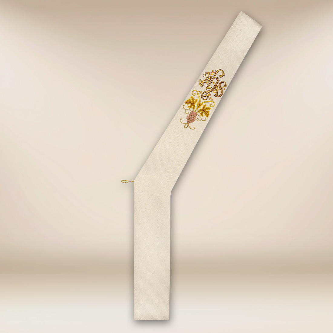 Prezentowana stuła została wykonana w eleganckim kolorze ecru, który symbolizuje czystość, światło i duchową radość. Barwa ta doskonale wpisuje się w uroczyste okresy roku liturgicznego, takie jak święta, ważne jubileusze czy sakramenty. Centralnym elementem dekoracyjnym jest haftowany symbol IHS – tradycyjny chrystogram, który od wieków przypomina o obecności Jezusa Chrystusa w liturgii i życiu Kościoła. Starannie wykonany haft charakteryzuje się wysoką trwałością oraz precyzją detalu.