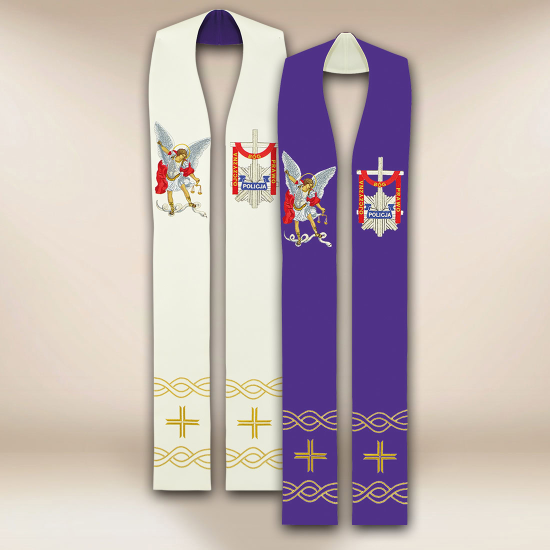 Stuła haftowana dwustronna „Policyjna” to elegancka szata liturgiczna dedykowana duszpasterzom Policji oraz kapelanom służb mundurowych. Wykonana z wysokiej jakości tkaniny liturgicznej, łączy lekkość, trwałość i doskonałe układanie podczas liturgii.