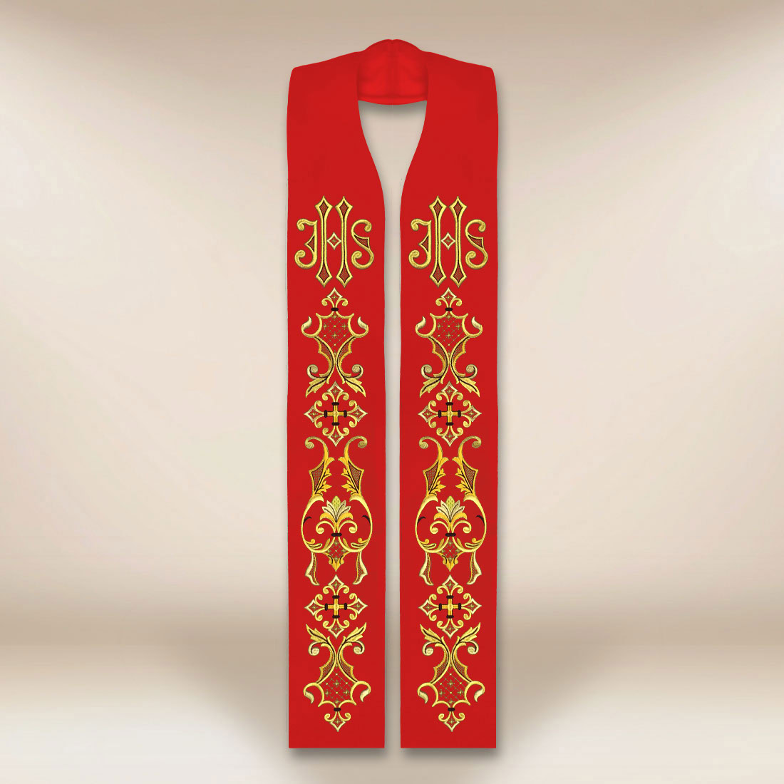 Haftowana stuła liturgiczna czerwona z IHS to elegancka i klasyczna szata kapłańska przeznaczona na uroczystości Zesłania Ducha Świętego, święta męczenników oraz celebracje apostolskie.