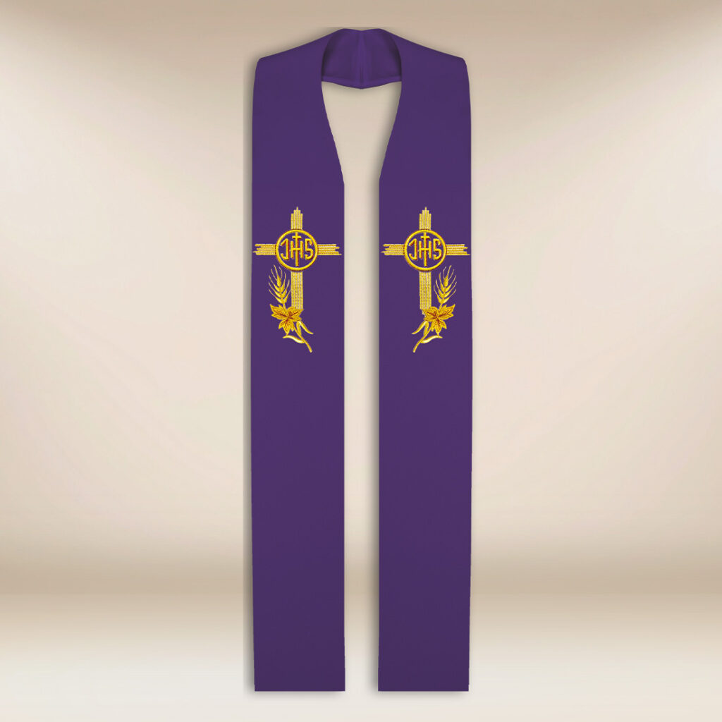 Haftowana stuła kapłańska IHS fioletowa z krzyżem i kłosami stanowi ponadczasowe uzupełnienie szat liturgicznych, łącząc klasykę, funkcjonalność i głęboką symbolikę.