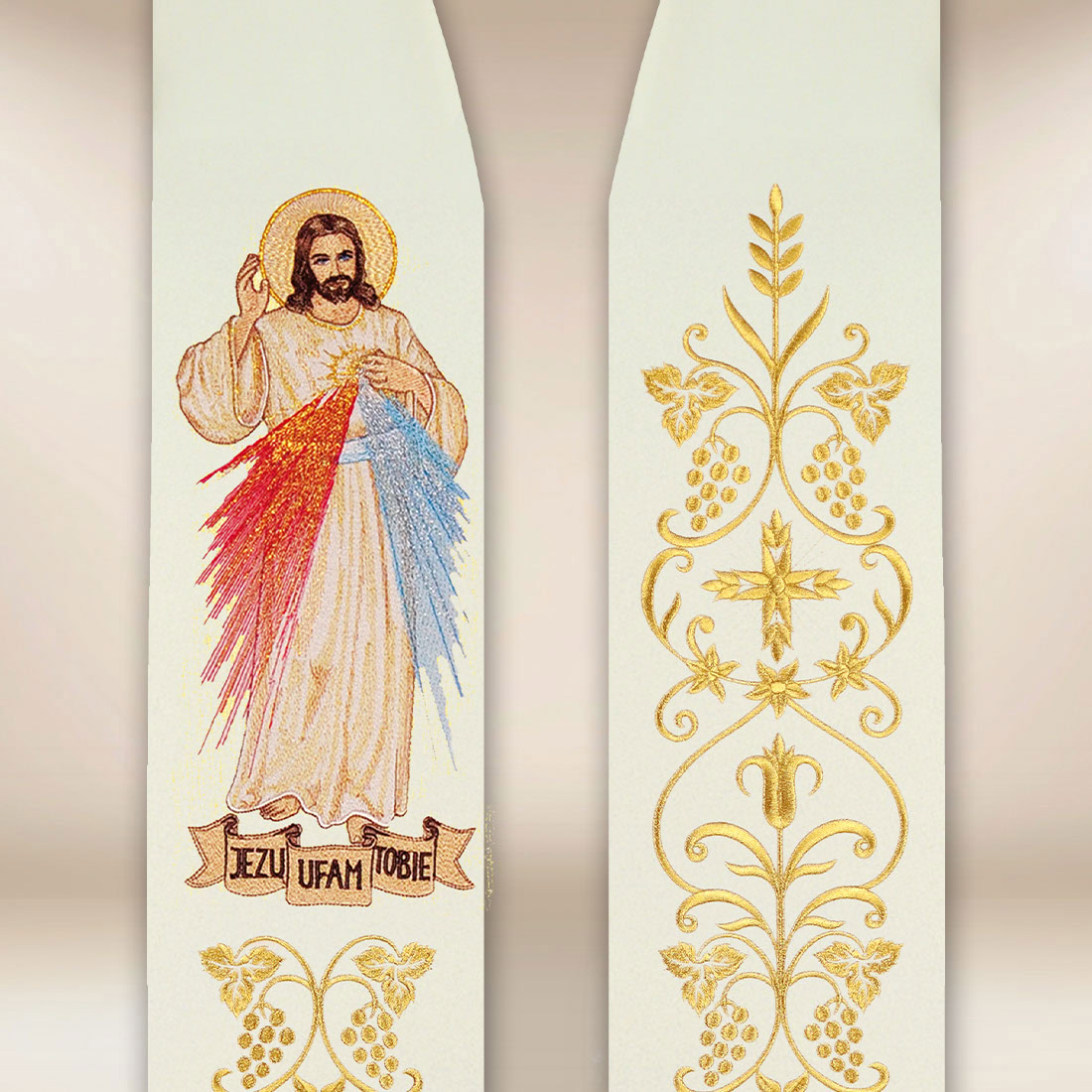 Stuła haftowana “Jezus Miłosierny” to wyjątkowa szata liturgiczna, która w sposób szczególny podkreśla duchowy wymiar nabożeństw i celebracji związanych z kultem Bożego Miłosierdzia. W górnej części umieszczono dopracowany haft wizerunku Jezusa Miłosiernego, z charakterystycznymi promieniami — czerwonym i bladoniebieskim — symbolizującymi krew i wodę wypływające z Serca Zbawiciela. U dołu znajduje się subtelny napis Jezu Ufam Tobie, będący wyrazem zawierzenia i ufności.