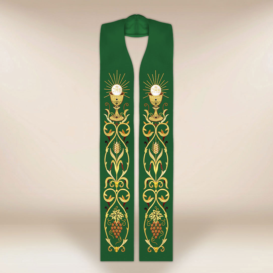 Haftowana stuła liturgiczna zielona z motywem kielicha to klasyczna i elegancka szata kapłańska przeznaczona do celebracji liturgicznych w okresie zwykłym.