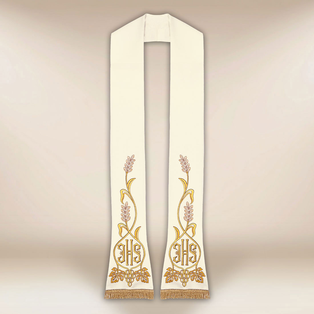 Haftowana stuła liturgiczna IHS ecru wykonana z wysokiej jakości tkaniny o starannie dobranej mieszance włókien to elegancka propozycja dla kapłanów ceniących klasyczne wzornictwo.