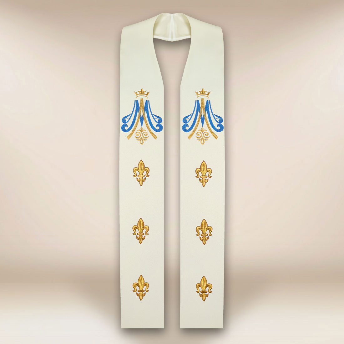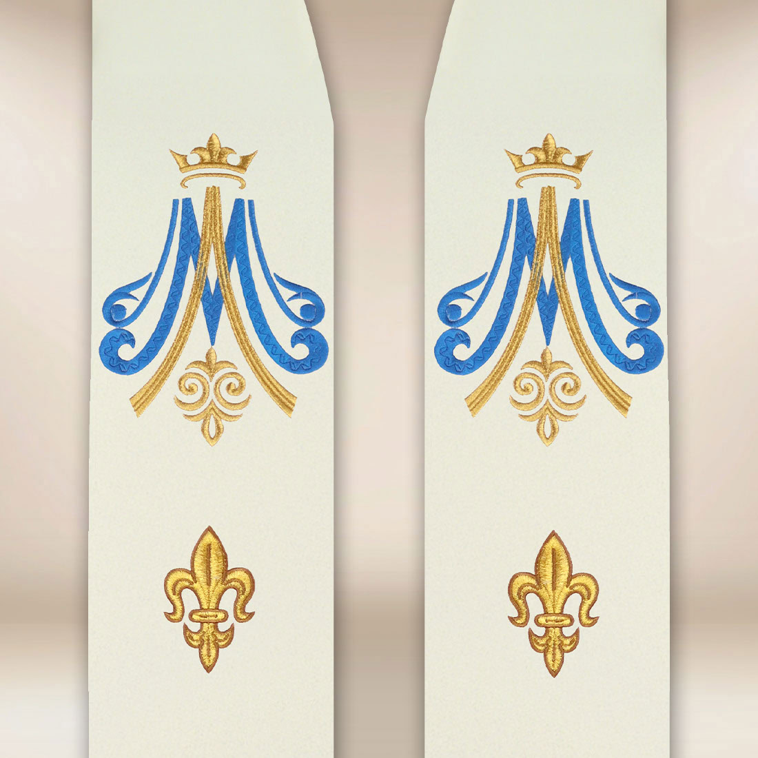 Stuła haftowana „Maryjna” została zaprojektowana z myślą o uroczystościach i celebracjach poświęconych Matce Bożej. Centralnym elementem kompozycji jest haftowany monogram Maryi zwieńczony koroną, który od wieków stanowi symbol królewskiej godności i szczególnej czci, jaką Kościół oddaje Matce Zbawiciela. Motyw ten został wykonany z dbałością o proporcje i lekkość linii, a jego niebiesko-złota forma harmonijnie współgra z jasnym tłem stuły.