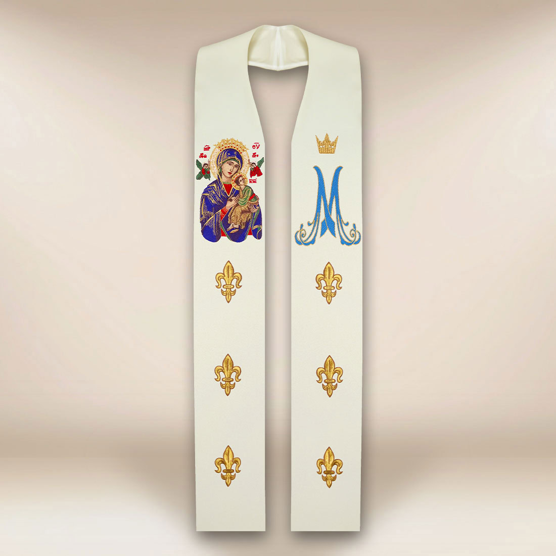 Stuła haftowana „Matka Boża Nieustającej Pomocy” to wyjątkowa propozycja dla kapłanów pragnących podkreślić maryjny charakter celebracji. Centralny element stanowi haftowany wizerunek Matki Bożej Nieustającej Pomocy, wykonany z najwyższą starannością w wyrazistych barwach, które oddają ikonograficzną głębię tego obrazu. Motyw ten od wieków pozostaje symbolem opieki i czułej troski Maryi.