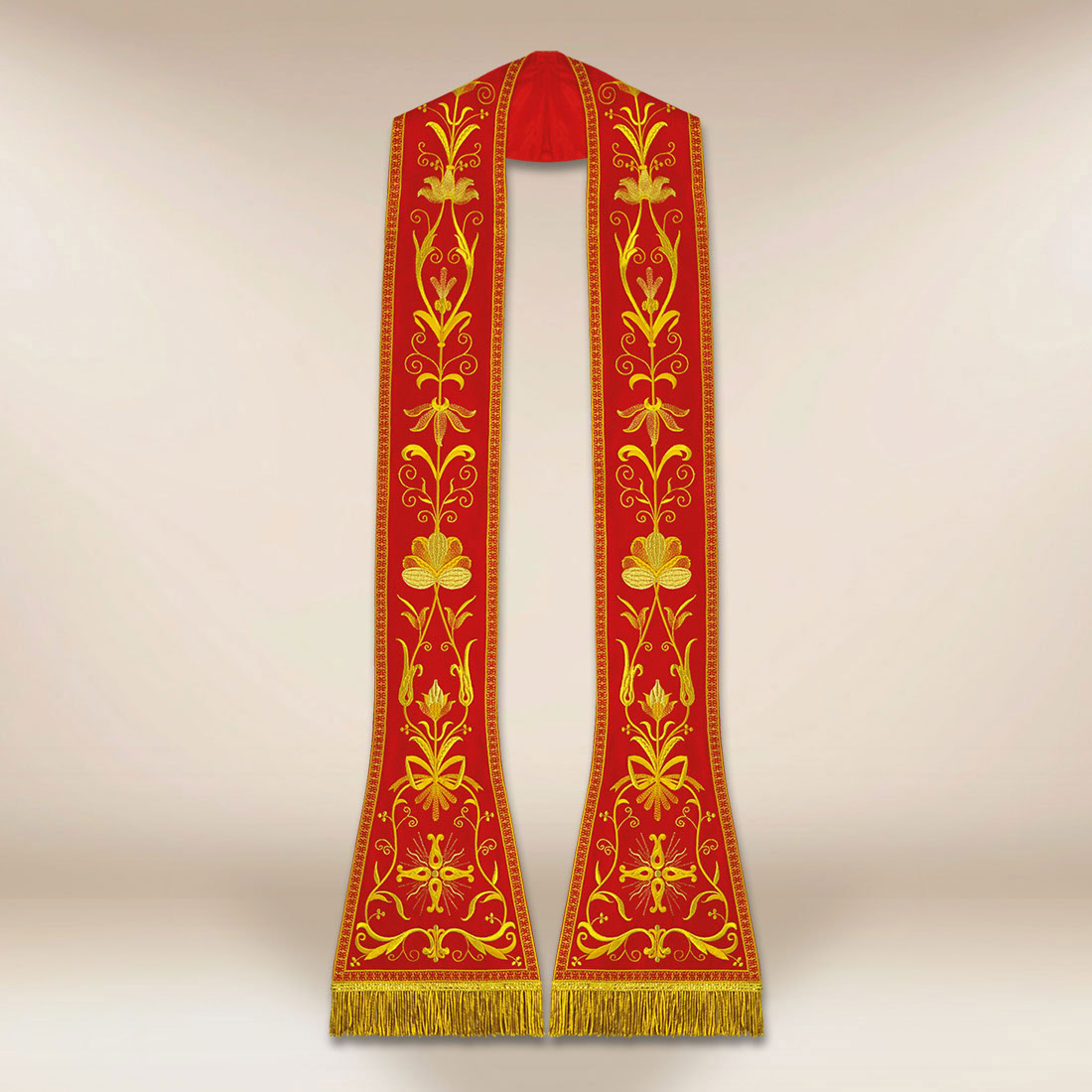 Czerwona rzymska stuła haftowana posiada rozmiar uniwersalny, dzięki czemu pasuje do każdego kapłana i zachowuje estetyczne proporcje podczas noszenia.