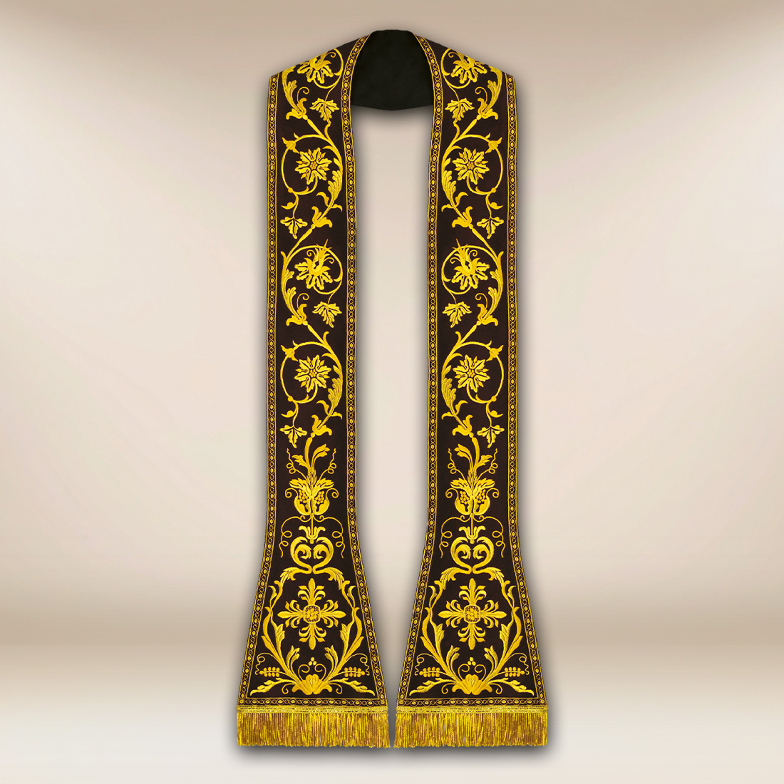 Stuła liturgiczna haftowana rzymska to klasyczna propozycja dla kapłanów ceniących głębokie zakorzenienie w tradycji i misterną sztukę haftu. Kompozycja zdobień oparta jest na eleganckich motywach florystycznych, wśród których dominują złociste kwiaty, liście oraz ornamentalne pnącza. Motywy te symbolizują duchowe odrodzenie oraz piękno stworzenia, a symetryczny układ haftów nadaje szacie szlachetnego, rzymskiego charakteru.
