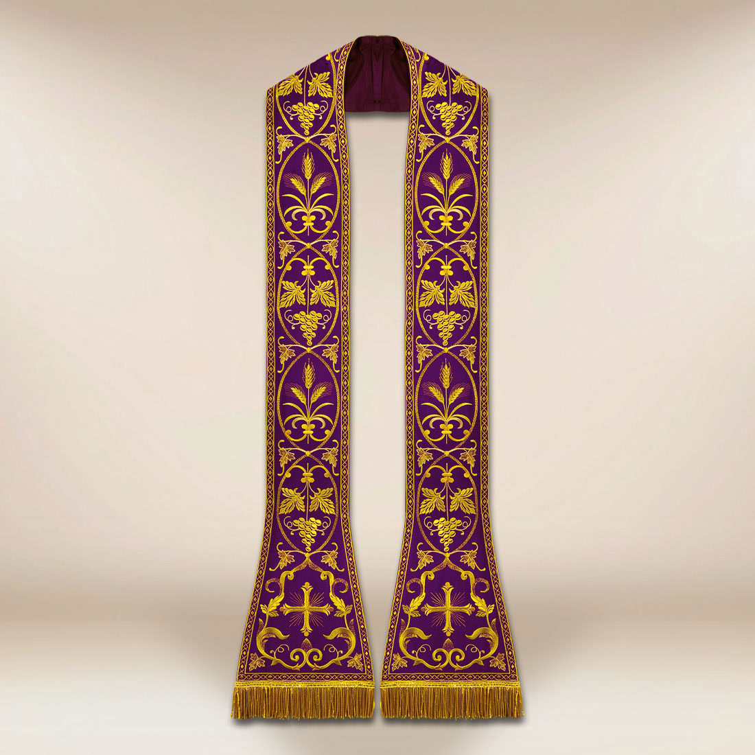 Liturgiczna rzymska stuła haftowana fioletowa wykonana z wysokiej jakości tkaniny i zdobiona bogatymi haftami w odcieniu złota, tworzącymi harmonijny układ winogron, liści, kłosów oraz roślinnych ornamentów.