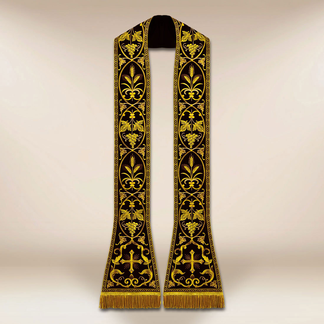 Liturgiczna rzymska stuła haftowana czarna to wyjątkowy element stroju liturgicznego przeznaczony dla kapłanów, którzy cenią tradycję Kościoła, elegancję oraz precyzyjnie wykonane zdobienia o głębokiej symbolice. Jej kompozycja oparta na naprzemiennych motywach winogron i kłosów zboża nawiązuje do symboliki Eucharystii – Krwi i Ciała Chrystusa. Ten klasyczny motyw od wieków obecny w sztuce sakralnej przypomina o centralnym miejscu Eucharystii w życiu Kościoła i podkreśla duchowy wymiar sprawowanej liturgii.