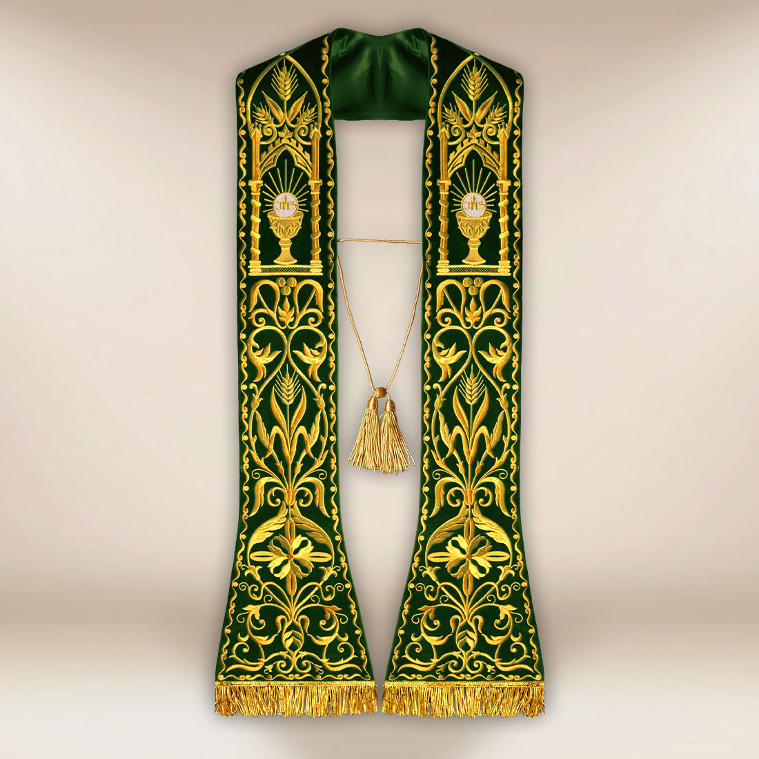 Stuła haftowana rzymska Kielich zielona została wykończona z wyjątkową starannością — metalizowane cingulum oraz frędzle włoskiej produkcji dodają jej reprezentacyjnego charakteru. Produkt posiada rozmiar uniwersalny, dzięki czemu pasuje do każdego kapłana i doskonale komponuje się z ornatami utrzymanymi w klasycznym stylu.