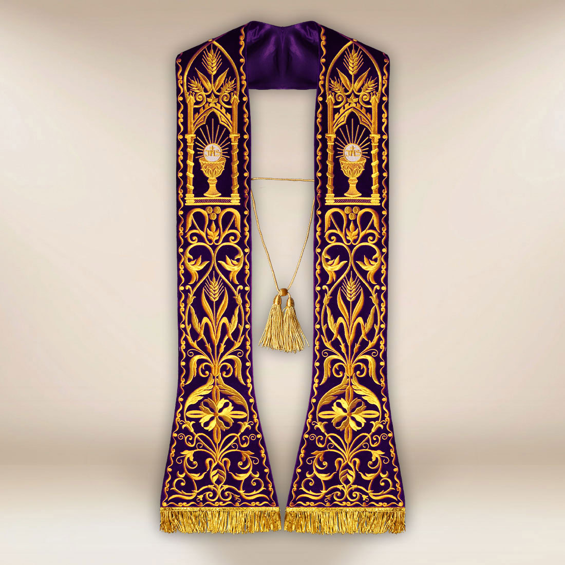 Stuła haftowana rzymska Kielich fioletowa posiada rozmiar uniwersalny, odpowiedni dla każdego kapłana, a jej eleganckie proporcje sprawiają, że doskonale prezentuje się podczas Mszy świętych, nabożeństw eucharystycznych, adoracji oraz liturgii wymagających podniosłej oprawy.