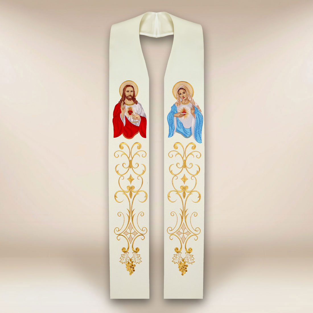 Stuła haftowana „Serce Jezusa i Maryi” łączy w sobie piękno tradycji liturgicznej z głęboką symboliką teologiczną. To szata, która w pierwszym spojrzeniu ukazuje Najświętsze Serce Pana Jezusa – znak miłości, przebaczenia i nieustannej troski o człowieka. Po drugiej stronie znajduje się Niepokalane Serce Maryi, pełne czułości, pokoju i bezwarunkowego oddania Bogu. Wspólne przedstawienie tych dwóch wizerunków nadaje stule wyjątkowego charakteru i czyni ją idealną na nabożeństwa wynagradzające, uroczystości maryjne oraz wiele celebracji w ciągu roku.