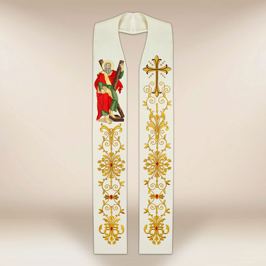 Stuła haftowana z wizerunkiem Św. Andrzej układa się miękko i prezentuje się znakomicie podczas Mszy świętych oraz uroczystości patronalnych.