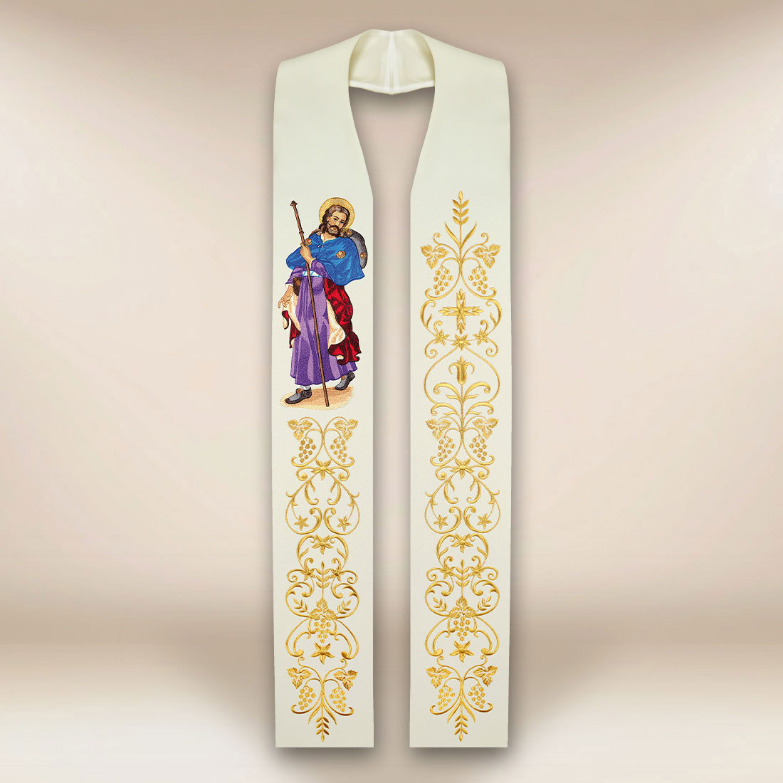 Wyjątkowa stuła haftowana „Św. Jakub” została zaprojektowana z myślą o kapłanach, którzy pragną podkreślić liturgię pięknem symboliki związanej z drogą ucznia Chrystusa. Na jednym z pasów znajduje się misterny haft przedstawiający św. Jakuba Apostoła, jednego z najbliższych uczniów Zbawiciela, czczonego jako patron pielgrzymów, podróżnych i poszukujących duchowego odnowienia. Ukazany w charakterystycznym stroju, z laską pielgrzyma, przypomina o powołaniu do nieustannego podążania za Chrystusem.