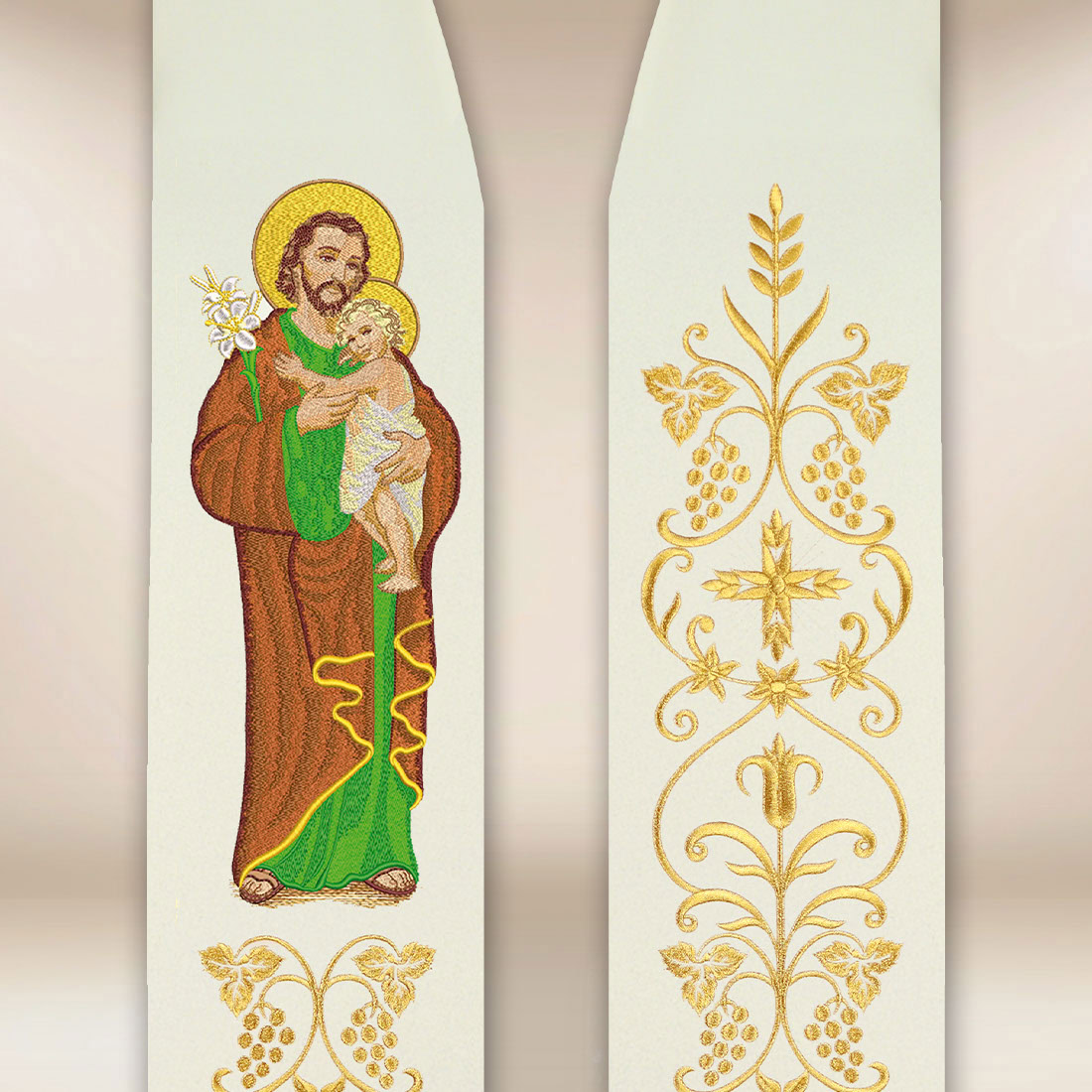 Elegancka stuła haftowana “Św. Józef” wykonana z wysokiej jakości tkaniny, miękkiej i przyjemnej w dotyku. Zdobiona precyzyjnym haftem Świętego Józefa z Dzieciątkiem Jezus oraz klasycznym, złotym ornamentem liturgicznym. Stuła doskonale układa się na albie, a klasyczny krój sprawia, że harmonijnie komponuje się z wieloma ornatami. W zestawie znajdują się 2 kołnierzyki wycinane laserowo, dodawane do każdej stuły.