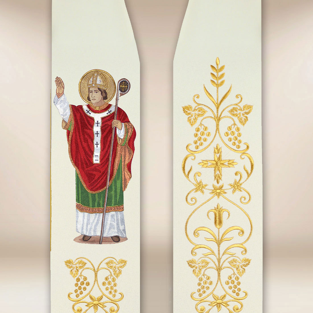 Drugie ramię stuły oraz dolne partie obu pasów zdobi bogaty, roślinno-symboliczny ornament, którego złota kompozycja dodaje całości elegancji i liturgicznej dostojności. Wzór jest harmonijny, szlachetny i ponadczasowy, dzięki czemu stuła świetnie prezentuje się z ornatami, kapami oraz innymi szatami liturgicznymi.