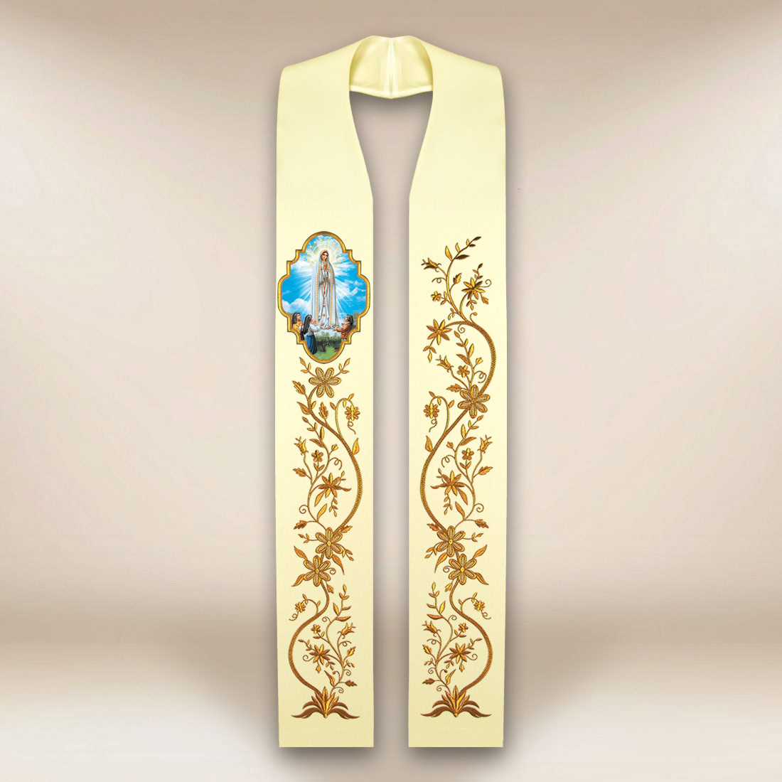 Stuła haftowana „Matka Boska Fatimska z dziećmi” łączy w sobie teologiczne piękno objawień fatimskich z elegancją haftowanej ornamentyki. Na lewym panelu znajduje się fotograficzny wizerunek Matki Bożej Fatimskiej wraz z pastuszkami, przeniesiony na tkaninę nowoczesną metodą, która gwarantuje wyjątkową wyrazistość, trwałość oraz naturalne przejścia barwne.