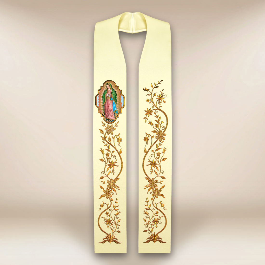 Stuła haftowana „Matka Boża z Guadalupe” została zaprojektowana z myślą o celebracjach maryjnych, w których symbolika objawień z Meksyku odgrywa szczególną rolę. W centralnej części szaty znajduje się fotograficzny wizerunek MB z Guadalupe, przeniesiony na tkaninę za pomocą technologii gwarantującej trwałość oraz wyjątkowo naturalne przejścia tonalne. Jasne refleksy, delikatność rysunku i charakterystyczne kolory tworzą kompozycję głęboką w znaczeniu i elegancką wizualnie.