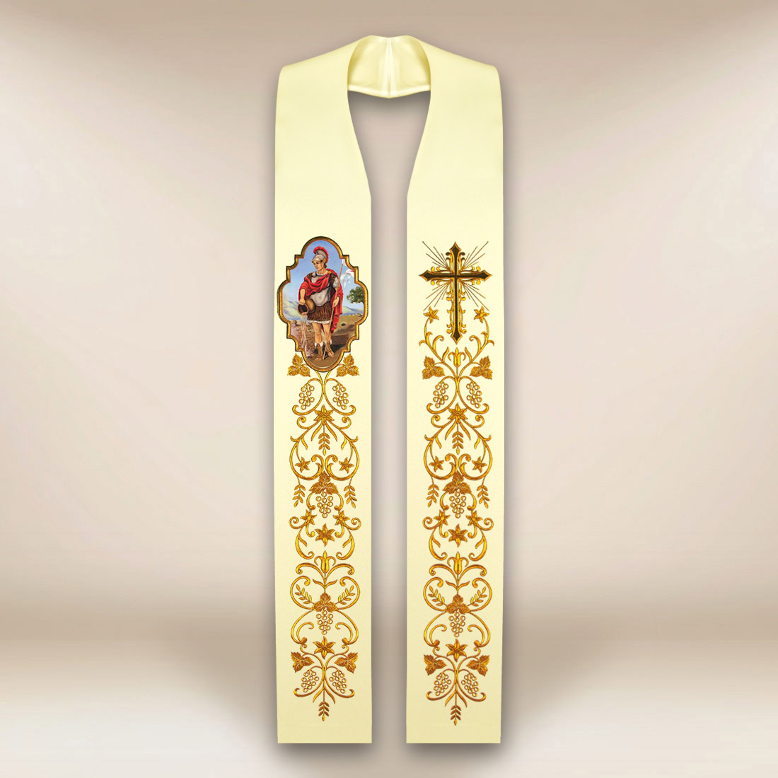 Elegancka stuła liturgiczna haftowana ecru z wizerunkiem św. Floriana, wykonanym w trwałej technologii fotograficznej, która zapewnia niezwykle żywe i realistyczne kolory. Bogaty haft roślinny i klasyczny krzyż tworzą harmonijną, sakralną kompozycję podkreślającą uroczysty charakter szaty. Wysokiej jakości tkanina Elana jest lekka, miękka i doskonale układa się podczas celebracji. Stuła idealna na Msze święte, uroczystości parafialne i nabożeństwa ku czci św. Floriana. W zestawie znajdują się 2 kołnierzyki wycinane laserowo, zwiększające komfort użytkowania
