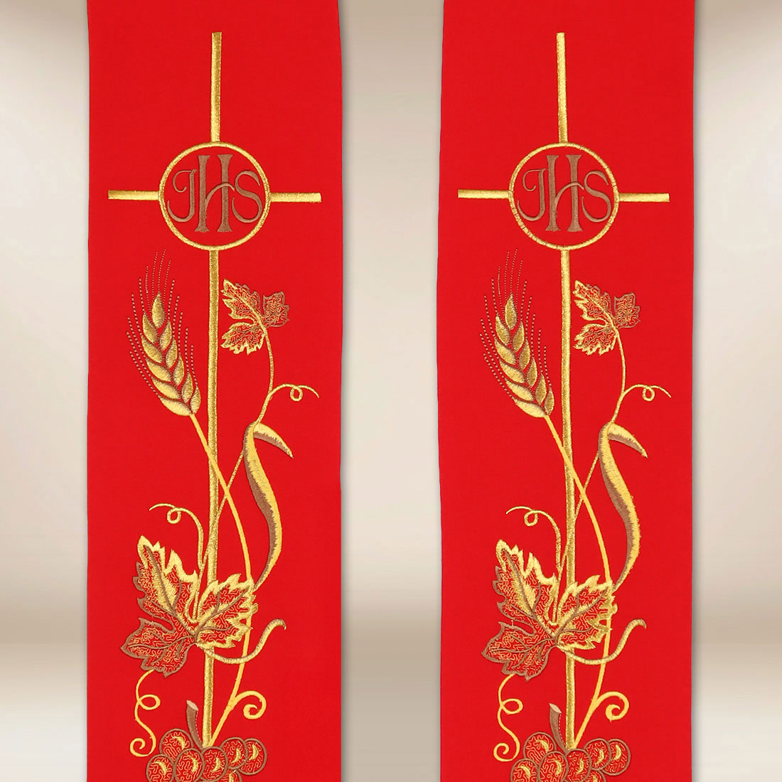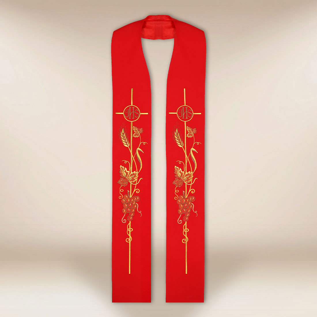 Stuła haftowana czerwona IHS Kłosy i Winogrona została zaprojektowana jako szata liturgiczna podkreślająca eucharystyczne centrum życia Kościoła oraz duchową głębię sprawowanej liturgii. Jej kompozycja opiera się na klasycznej symbolice chrześcijańskiej, w której centralne miejsce zajmuje monogram IHS — znak imienia Jezus, od wieków obecny w tradycji sakralnej jako wyraz wiary w realną obecność Chrystusa w Eucharystii. Umieszczony na tle haftowanego krzyża symbol nadaje szacie wyraźny, teologiczny charakter i kieruje uwagę ku misterium zbawienia uobecnianemu przy ołtarzu.