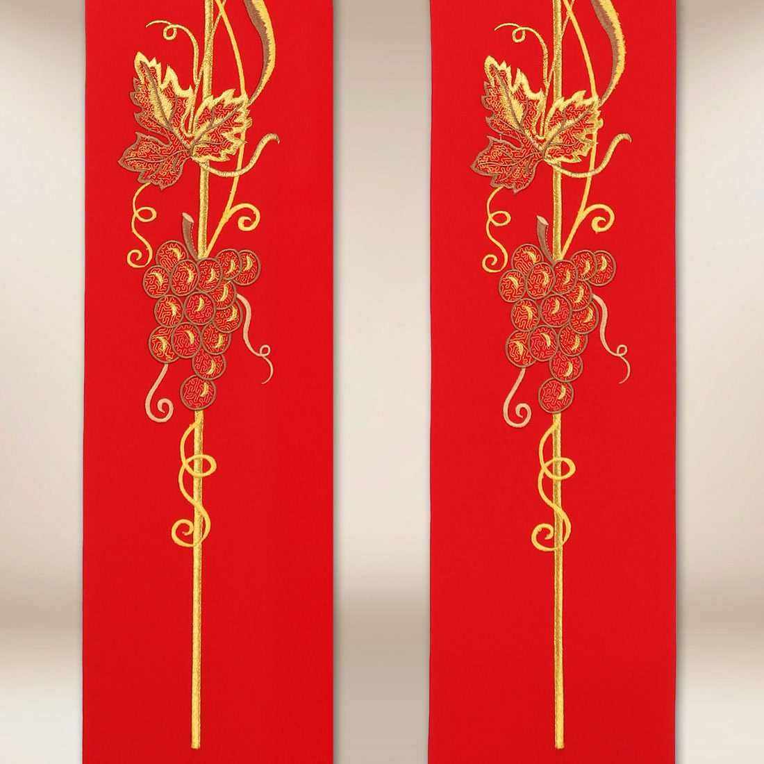 Stuła haftowana czerwona IHS Kłosy i Winogrona ma długość około 120 cm oraz klasyczny krój sprawiają, że szata harmonijnie współgra z różnymi ornatami i kapami liturgicznymi, zachowując proporcjonalny i elegancki wygląd. W zestawie znajdują się dwa kołnierzyki wycinane laserowo, które stabilizują stułę na albie i pomagają utrzymać jej estetyczne ułożenie przez cały czas celebracji.