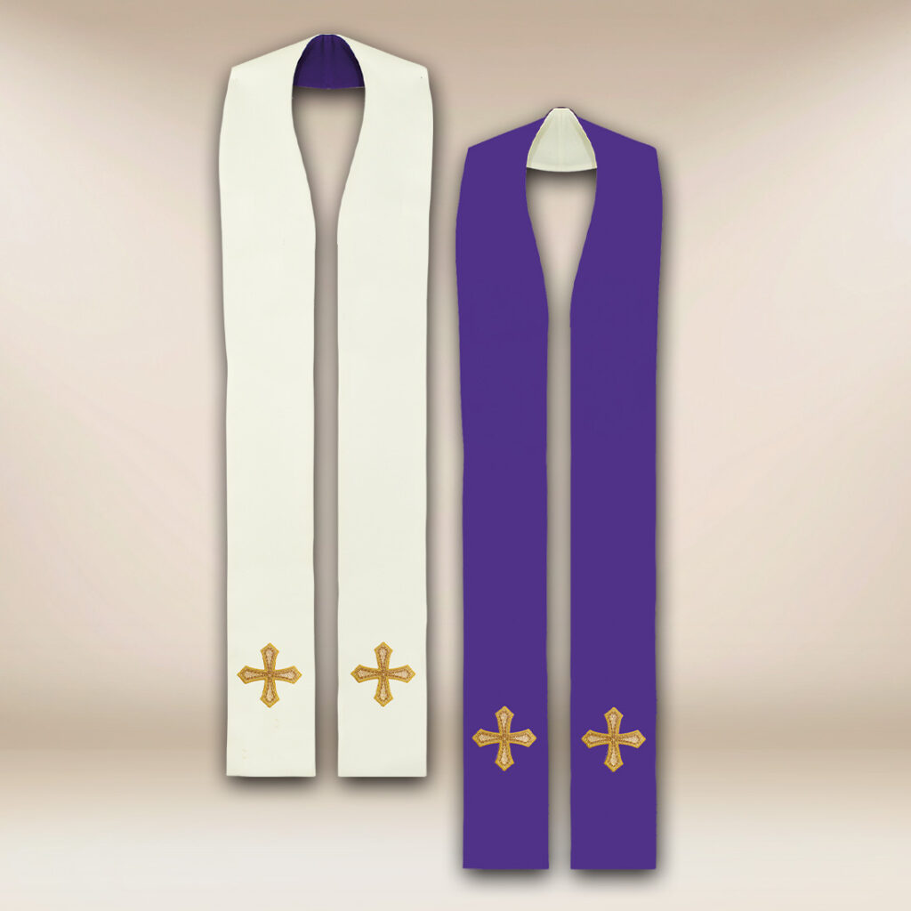 Stuła kapłańska dwustronna fioletowo-ecru stanowi harmonijne połączenie praktyczności i klasycznej formy, odpowiadając potrzebom kapłanów, którzy cenią umiar, porządek i liturgiczną spójność.