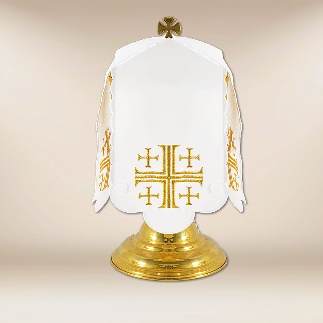 Sukienka na puszkę Krzyże Jerozolimskie została zaprojektowana jako reprezentacyjne okrycie Najświętszego Sakramentu, przeznaczone do użytku liturgicznego w kościołach, kaplicach oraz sanktuariach. Jej forma opiera się na klasycznych wzorcach sztuki sakralnej, w których prostota kompozycji łączy się z głęboką treścią teologiczną. Produkt doskonale sprawdzi się zarówno podczas codziennej adoracji, jak i w trakcie uroczystych nabożeństw.