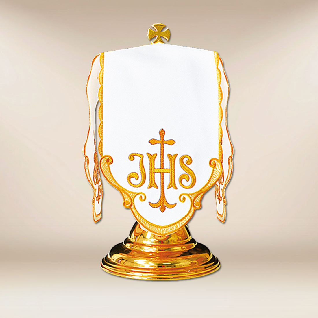 Centralnym elementem zdobienia jest haftowany symbol IHS, będący skrótem imienia Jezusa Chrystusa i czytelnym znakiem Jego obecności w Najświętszym Sakramencie. Kompozycja haftu została opracowana z dbałością o proporcje i czytelność, dzięki czemu dekoracja zachowuje liturgiczną powagę oraz elegancję. Motyw ten od wieków zajmuje szczególne miejsce w tradycji Kościoła, stanowiąc wyraz wiary i czci eucharystycznej.