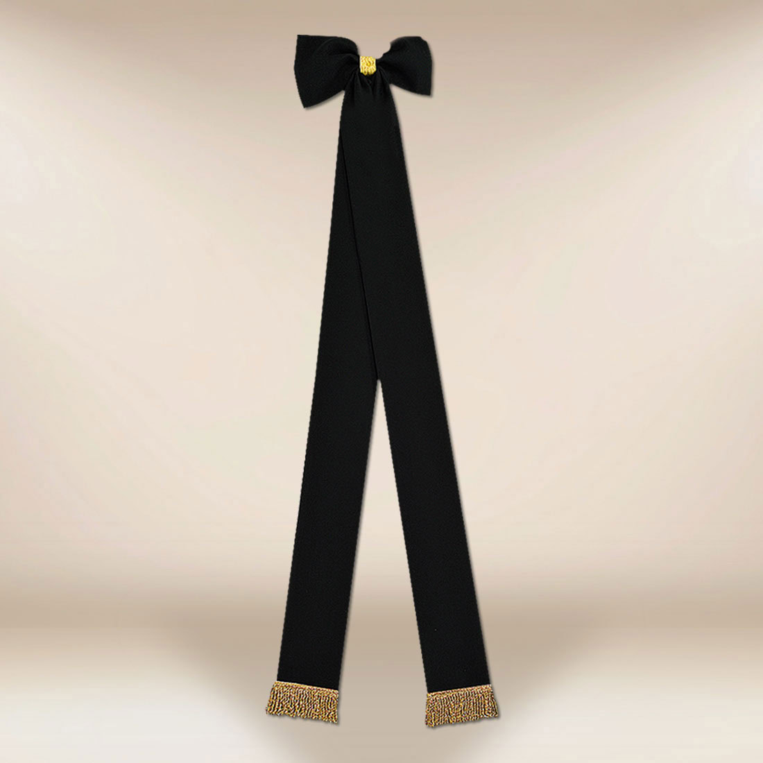 Elegancka czarna szarfa z kokardą z frędzlami, idealna do sztandarów i oficjalnych uroczystości.