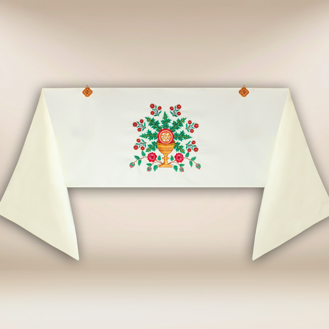 Welon naramienny inspirowany subtelnymi motywami tradycji Podhala, łączący regionalną wrażliwość z klasyczną elegancją liturgiczną.